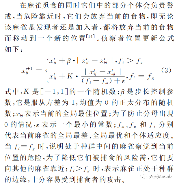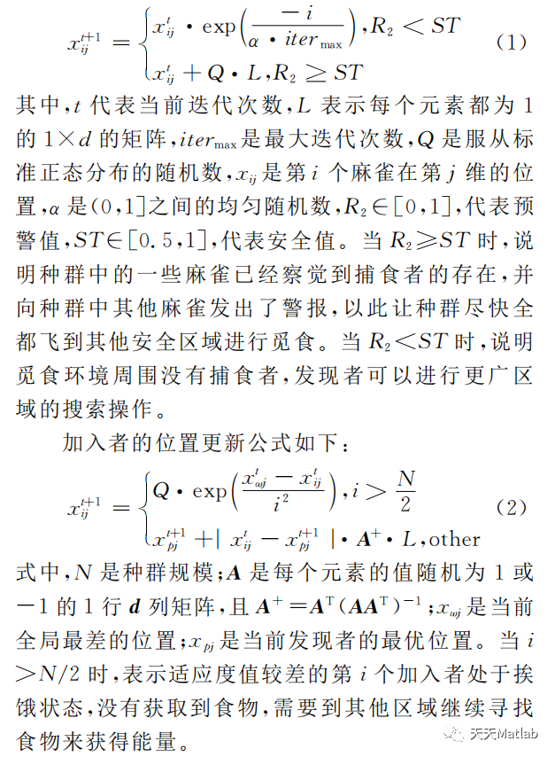 麻 雀 搜 索 算 法 (sparrow search algorithm,SSA)提 出 时 间 是2020年,它 是 根 据 麻 雀 觅 食并逃避捕食者的行为而提出的群智能优化算法。麻雀搜索算法主要模拟了麻雀群觅食的过程。每只麻雀都有3种可能的行为:发现者:搜索食物;加入者:跟随发现 者 觅 食;侦 察 者:警 戒 侦 查。其 中,发 现 者是麻雀中找 到 食 物 较 早 的 个 体,加入者则为其他个体,同时在麻雀种群中还有一定比例的个体进行侦查预警,它们的任务是在发现危险的情况下就放弃食物,选择安全第一。