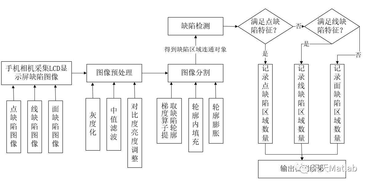 完成对LCD显示屏有缺陷的图像的缺陷识别检测。首先要采集图像,找不到符合条件的图像就结合图像特点进行模拟,以缺陷中的点缺陷、线缺陷和面缺陷作为需要检测的缺陷三种类型。对得到的图像进行预处理,转换为灰度图像,先进行滤波,去除干扰噪声等,如果图像整体灰度区分不明显,比较暗,也可以对图像的对比度亮度等进行调整,调整到适合后边图像处理的状态。接下来为了检测到图像的主要部分,也就是缺陷区域,需要单独把缺陷提取识别出来,和背景区别开,比如将缺陷区域置为1,背景置为0,形成一个二值图像。选择适合的方式来进行图像的分割,提取缺陷的边缘,边缘置1,其他置0。对边缘进行膨胀处理,因为提取到的边缘进行了二值化,可能会导致原图像区域中本该连通的地方断裂,为了保证每个缺陷区域的特征不变,需要对缺陷边缘处理。同时对缺陷边缘内进行填充,这样就将缺陷区域和背景分割开,提取到目标。再接下来对缺陷进行检测,使用MATLAB中测量区域属性的函数,得到图像中每一个提取到的缺陷区域的特征属性。我们要知道点、线和面的特征区别,比如点的面积要小,线的长宽比要很大且面积不能太大,不满足以上两点要求那就被做为面来看待。这就是大概的缺陷类型识别的一个判断思路。根据这个思路,我们得到一张图中的缺陷是什么类型的缺陷,并判断它的数量。进行整个流程如下图所示。