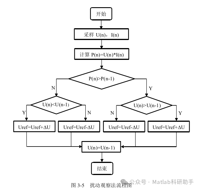P&O算法通过不断扰动光伏阵列的电压或电流并观察输出功率的变化来跟踪最大功率点。算法的流程如下: