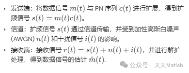 直接序列扩频 (DSSS) 是一种重要的扩频通信技术,它通过将信息信号与一个伪随机噪声序列进行扩展,来提高系统的抗干扰能力和保密性。在实际应用中,DSSS 系统不可避免地会受到各种干扰的影响,因此研究带干扰的 DSSS 系统的性能至关重要。