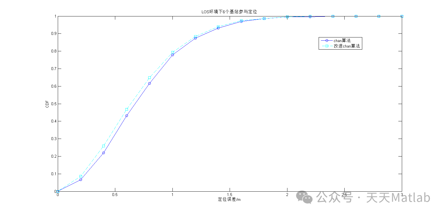 为了验证改进的Chan算法的性能,本文进行了仿真实验。仿真实验中,我们假设有6个基站均匀分布在一个半径为100米的圆形区域内,目标节点位于圆心。基站和目标节点之间为LOS环境。