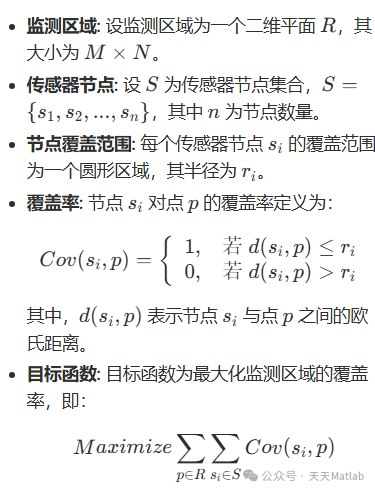 本文的优化目标是:在给定的监测区域内,合理地部署传感器节点,使得所有节点的覆盖区域能够最大程度地覆盖整个监测区域,并尽可能避免节点的重复覆盖。