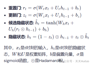 GRU是RNN的一种改进版本,它通过门控机制来控制信息的传递,有效地解决了RNN中梯度消失的问题。GRU包含两个门:更新门(update gate)和重置门(reset gate)。更新门控制前一时刻隐藏状态信息和当前时刻输入信息对当前时刻隐藏状态的贡献程度;重置门控制前一时刻隐藏状态信息对当前时刻候选隐藏状态的贡献程度。GRU的具体计算公式如下: