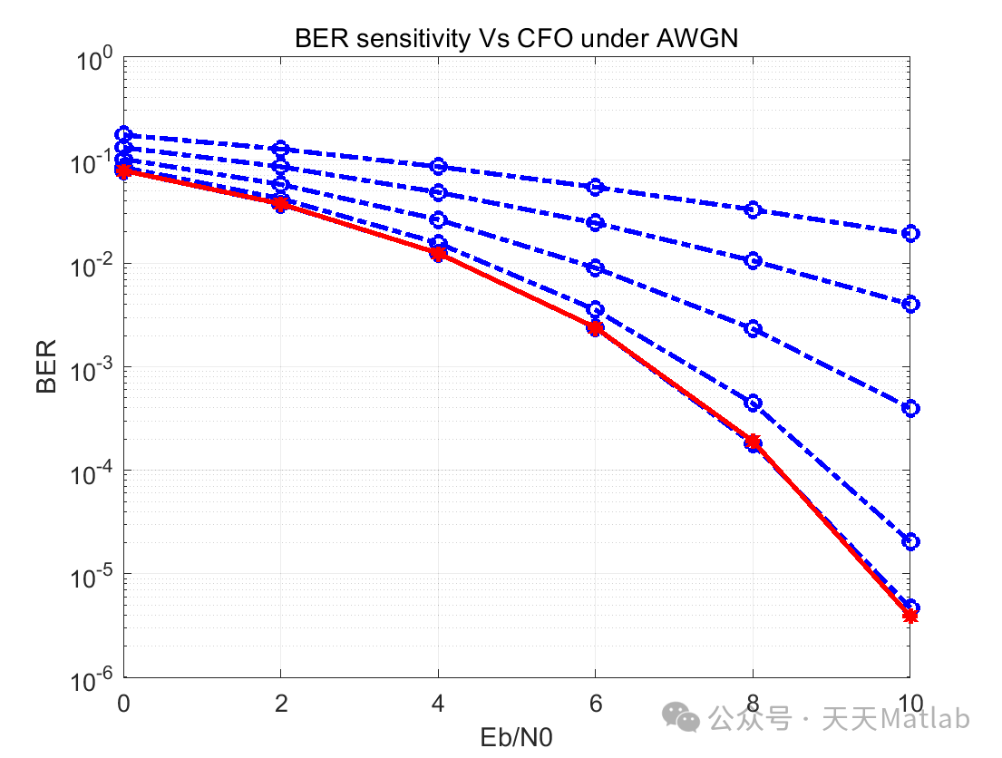 从上式可以看出,CFO不仅会导致相位旋转,还会引入ICI。ICI的大小取决于CFO的大小和子载波数。当CFO较大时,ICI会显著降低系统的BER性能。