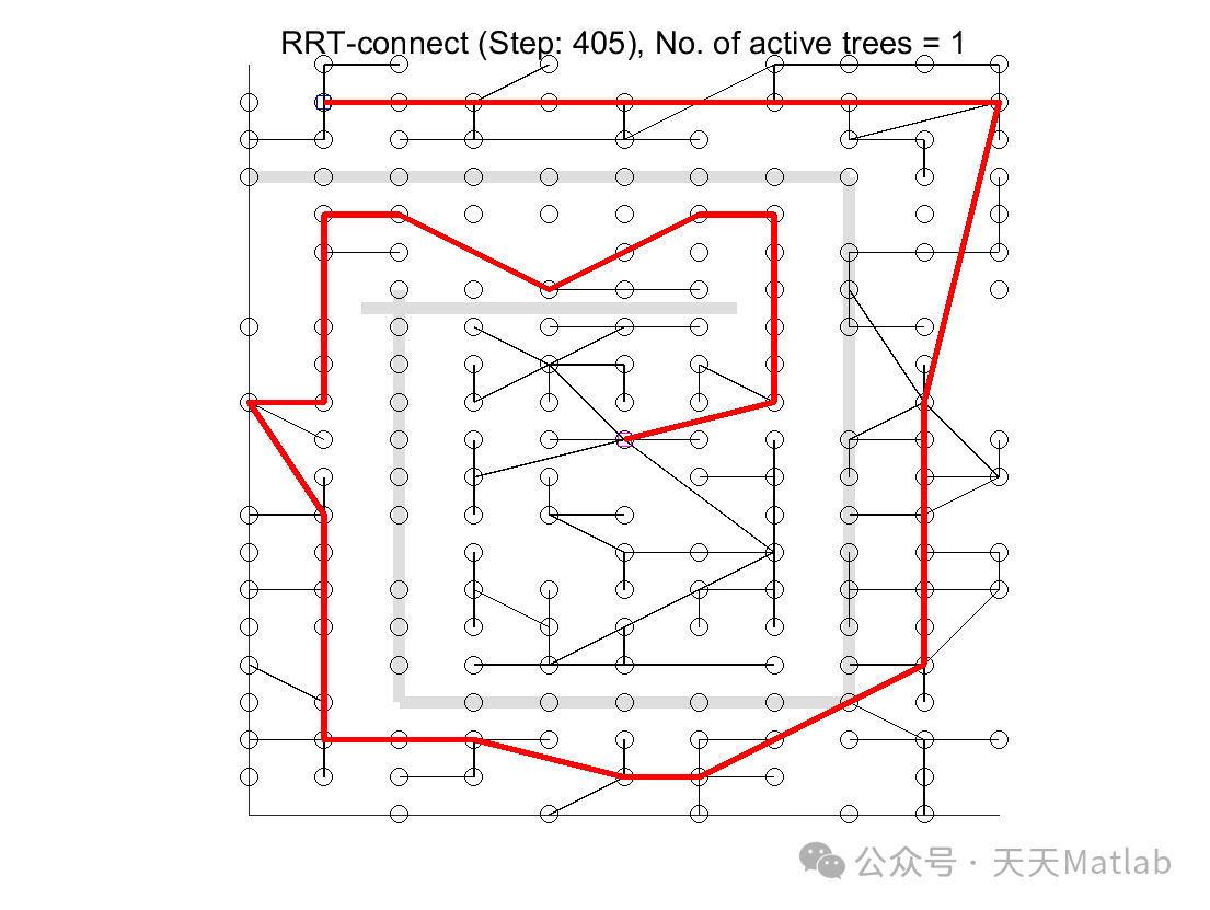 在每次扩展后,尝试连接两棵树。具体来说,从其中一棵树的新顶点向另一棵树的最近邻顶点方向扩展一段距离,检测是否能够成功连接。如果能够成功连接,则找到一条从起点到目标点的路径。