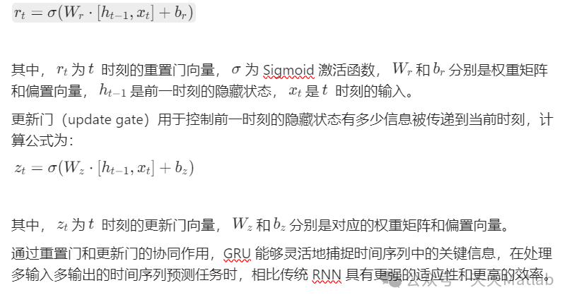 在多输入多输出预测任务中,将多个相关的输入变量按时间序列形式输入 GRU 网络。GRU 网络的隐藏层通过重置门和更新门对输入信息进行处理,学习输入变量之间的复杂关系和时间依赖特征。网络的输出层则根据任务需求,输出多个目标变量的预测值。例如,在气象预测任务中,输入温度、湿度、风速等历史数据,输出未来多个时刻的温度、降水量等预测值。
