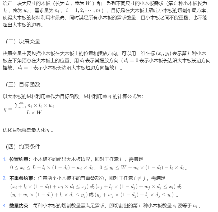 遗传算法由美国密歇根大学的约翰・霍兰德(John Holland)于 20 世纪 70 年代提出,它借鉴生物进化过程中的 “适者生存” 原则,通过选择、交叉和变异等遗传操作,对问题的潜在解进行迭代优化,逐步逼近最优解。遗传算法具有全局搜索能力强、对问题依赖性小、易于与其他算法结合等优点,适用于求解复杂的组合优化问题,大木板切割布局优化正是这类问题的典型代表。