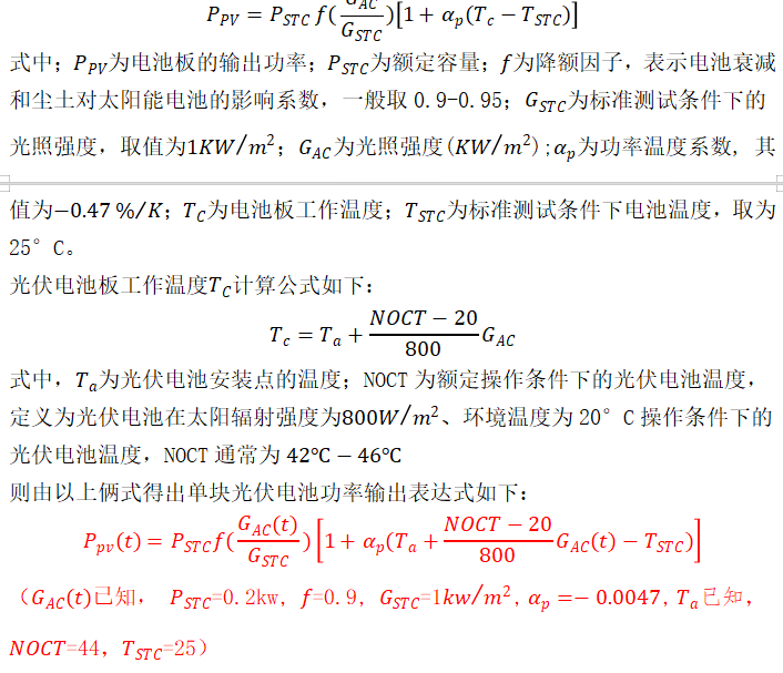 为了工程计算,一般光伏电池的功率输出可由如下所述的简化模型描述: