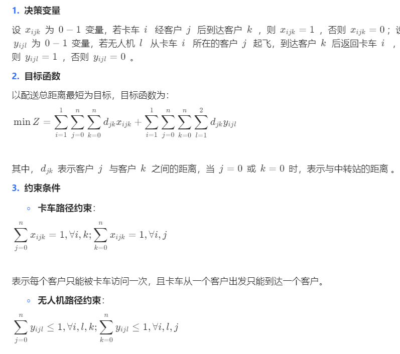 - 卡车和无人机的出发与返回时刻已知,不考虑装卸货时间。