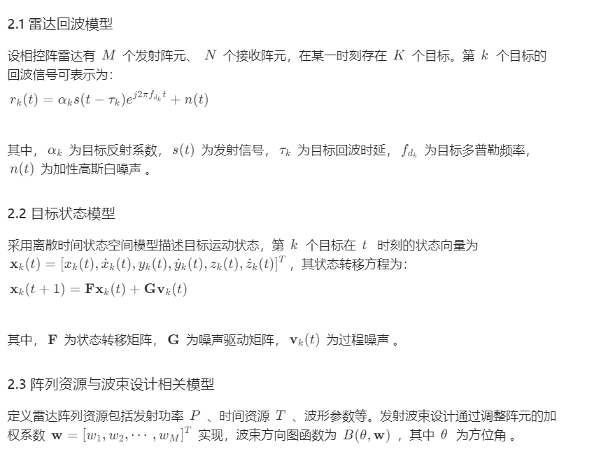 目前,阵列资源分配和发射波束设计的研究多为独立进行。在阵列资源分配方面,已有基于优先级、基于博弈论等方法,但这些方法未充分考虑波束设计对资源分配的影响;在发射波束设计上,传统方法如自适应波束形成等侧重于单目标或简单多目标场景,缺乏与资源分配的协同优化 。随着多目标跟踪场景复杂度增加,独立优化方式难以满足高精度、高效率的跟踪需求,亟需研究联合优化方法。
