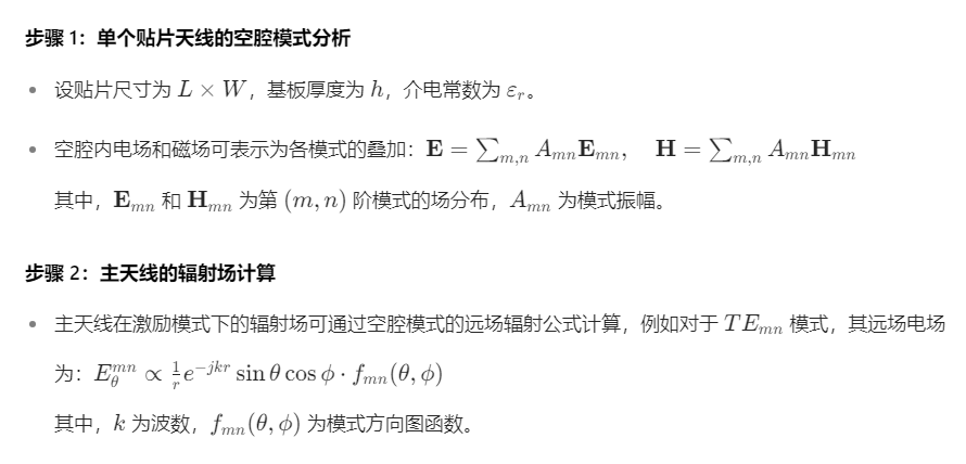 :基于模式展开法,将贴片天线的电磁场分解为一系列正交的空腔模式(如 TE<sub>mn</sub>和 TM<sub>mn</sub>模式),通过求解空腔的本征方程得到各模式的场分布和本征阻抗。