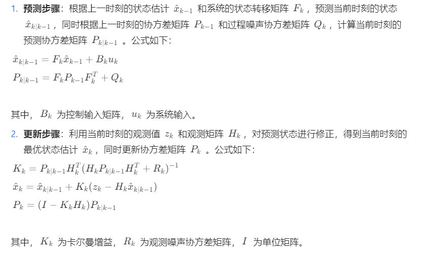 卡尔曼滤波器包含两个主要步骤:预测步骤和更新步骤。