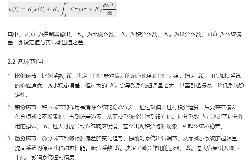PID 控制器由比例(Proportional)、积分(Integral)和微分(Derivative)三个环节组成。其控制原理是根据系统的设定值与实际输出值之间的偏差,通过比例、积分和微分运算,产生相应的控制量,以调节被控对象,使系统输出尽可能接近设定值 。PID 控制器的输出公式为: