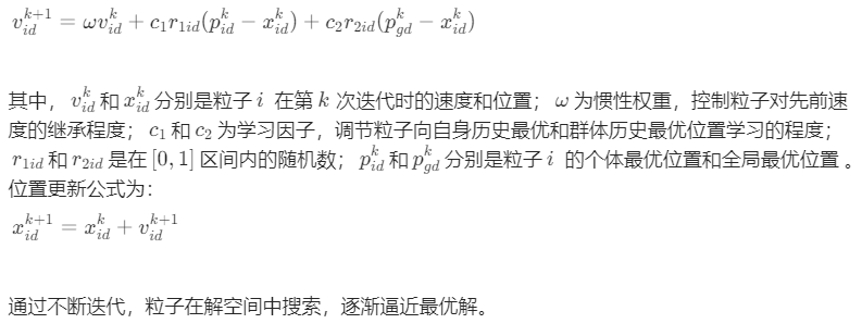PSO 算法中,每个粒子代表问题的一个潜在解,在多维解空间中运动。粒子在每次迭代时,根据自身历史最优位置(Pbest)和群体历史最优位置(Gbest)调整速度和位置。速度更新公式为: