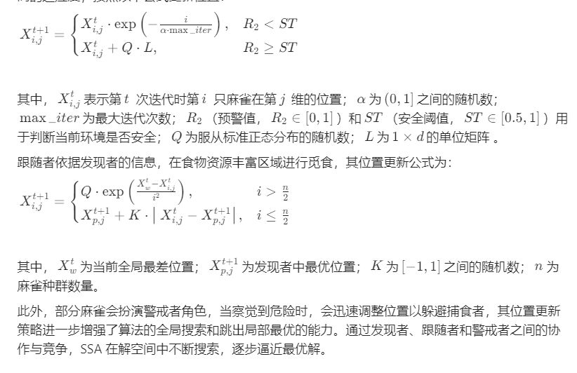 SSA 模拟麻雀在觅食过程中的发现者 - 跟随者角色转换和反捕食行为。算法中,麻雀群体分为发现者和跟随者两类。发现者负责在解空间中寻找食物资源丰富的区域,它们具有较大的搜索范围和较高的适应度,按照以下公式更新位置: