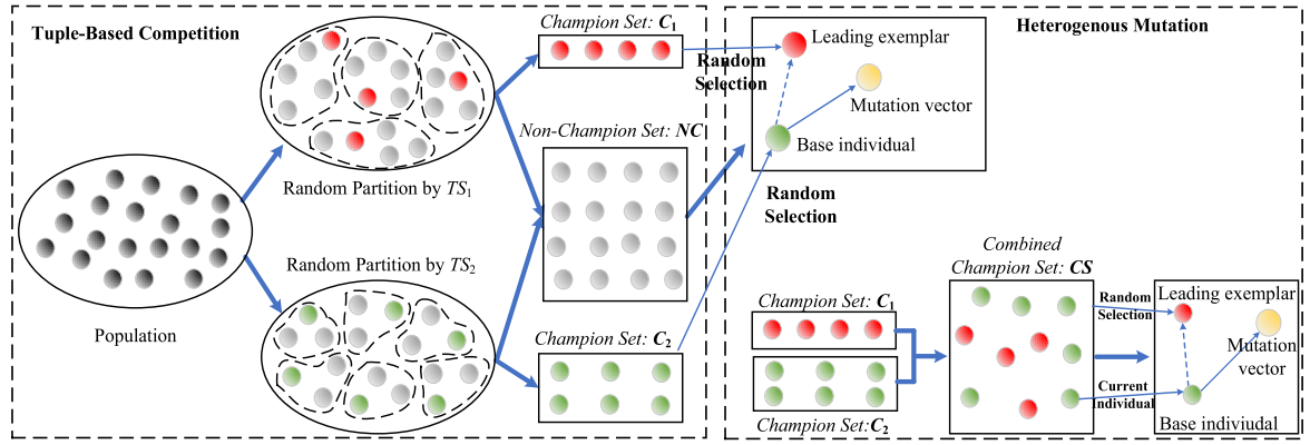 - 个体分组:根据随机规则,将种群个体划分为两个冠军集合和一个非冠军集合。