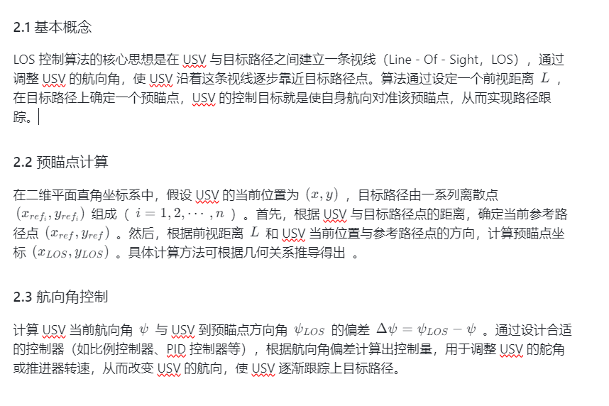 随着海洋开发和应用需求的不断增长,无人水面艇(USV)凭借其成本低、可在危险环境作业等优势,在海洋监测、物资运输、搜索救援等领域得到广泛应用。路径跟踪作为 USV 实现自主作业的核心技术之一,直接影响其任务执行的效率和准确性。LOS 控制算法因结构简单、易于实现且具有良好的跟踪性能,成为 USV 路径跟踪研究中的常用算法。本报告旨在通过仿真深入探究 LOS 控制算法在 USV 路径跟踪中的应用效果,为相关研究和实际应用提供参考。