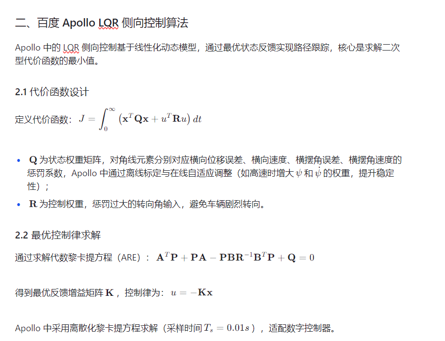 在自动驾驶车辆的侧向控制领域,百度 Apollo 平台作为开源自动驾驶系统的标杆,其侧向控制模块融合了线性二次调节器(LQR)和模型预测控制(MPC)两种经典算法,针对动态车辆模型的路径跟踪需求进行了工程化优化。本文基于动态车辆模型(单轨动力学模型),深入解析 Apollo 中 LQR 和 MPC 侧向控制算法的原理、实现细节及性能差异,揭示其在复杂路况下的控制逻辑与工程适配策略。