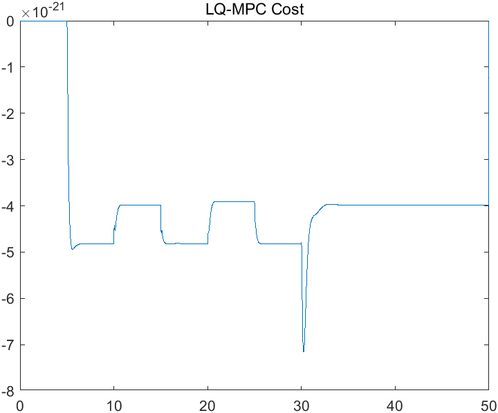 仿真与性能分析对比 LQR,LQ-MPC 考虑输入约束(如电机 PWM 信号范围),在跟踪参考轨迹(高度、姿态阶跃指令)时,通过滚动优化实时调整控制输入,绘制实际输出、估计误差、控制输入及成本函数曲线,验证其在约束条件下的优越性。