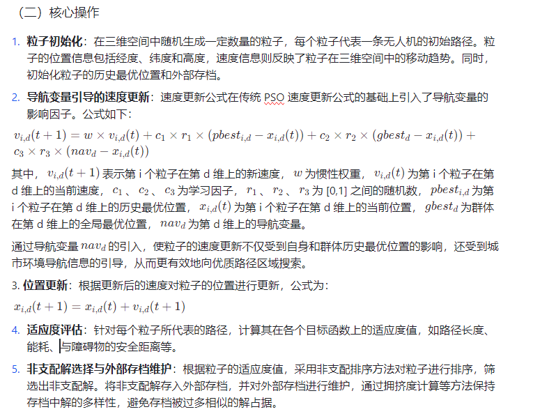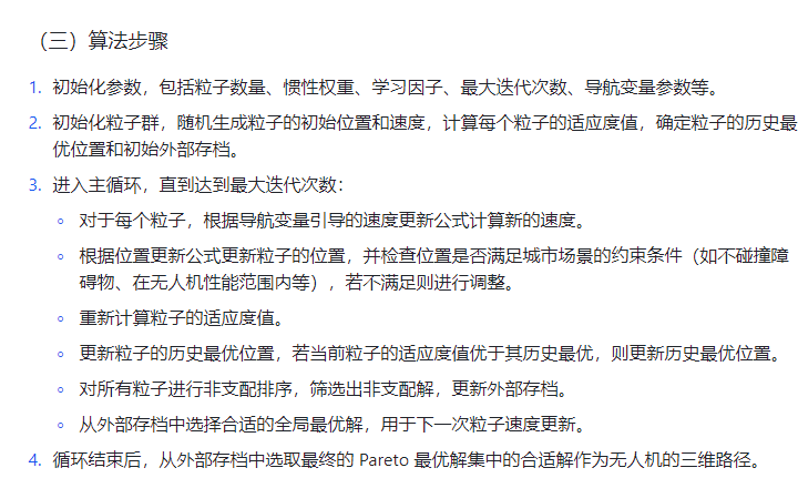 该算法的核心创新点在于将导航变量引入到多目标粒子群优化算法中。通过导航变量来引导粒子的搜索方向,使粒子能够更好地适应城市场景的复杂约束和多目标要求。导航变量能够反映城市环境的关键特征和无人机的导航需求,为粒子的位置和速度更新提供更有针对性的指导,从而提高算法的搜索效率和优化性能。