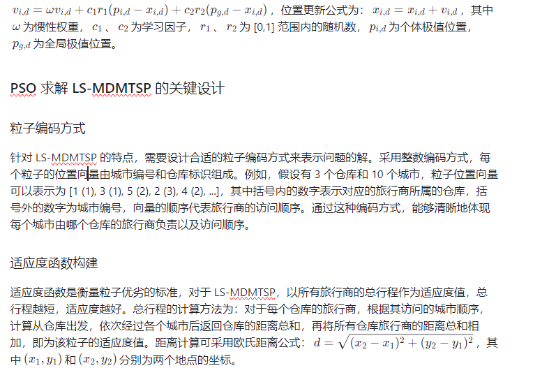 由于 LS-MDMTSP 的解空间是离散的,而标准 PSO 的速度和位置更新适用于连续空间,因此需要对更新方式进行调整。在速度更新时,将速度转化为城市交换的概率或位置调整的幅度;在位置更新时,通过插入、交换、反转等操作对城市访问顺序进行调整,确保更新后的位置仍然是一个有效的解(即每个城市仅被访问一次,且旅行商从对应仓库出发并返回)。同时,引入惯性权重的自适应调整策略,在算法初期设置较大的惯性权重以增强全局搜索能力,后期减小惯性权重以提高局部搜索精度。
