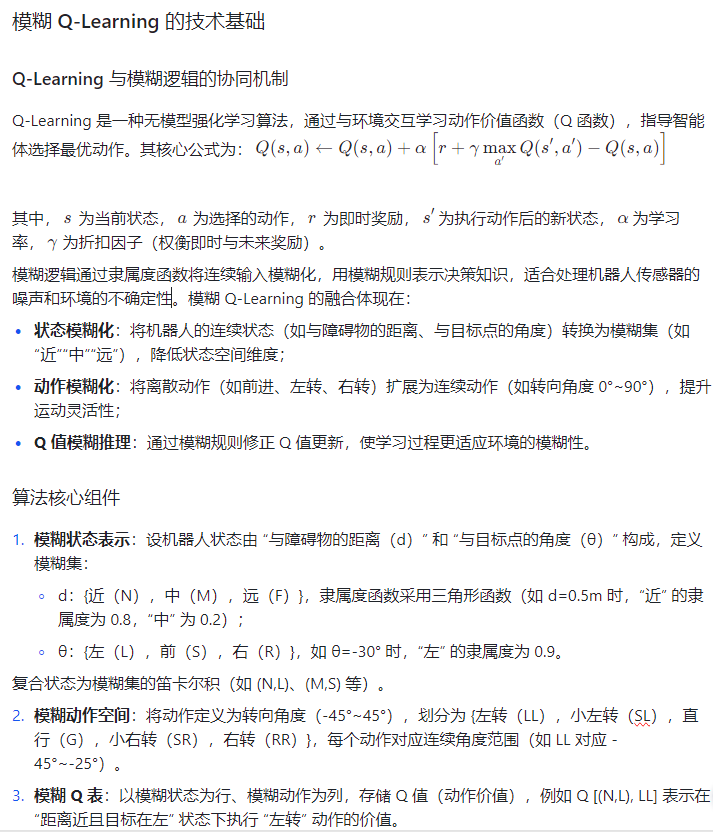 机器人路径规划是自主移动机器人实现自主导航的核心任务,旨在从起始点到目标点找到一条无碰撞、最优(如最短距离、最少时间)的路径。传统方法(如 A*、Dijkstra)在已知静态环境中表现优异,但在动态未知环境(如突然出现的障碍物、传感器噪声)中鲁棒性不足。模糊 Q-Learning 算法结合模糊逻辑的不确定性处理能力与 Q-Learning 的强化学习机制,能使机器人在复杂环境中通过试错学习自主规划路径,为动态未知场景提供高效解决方案。