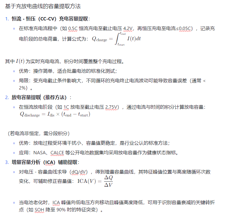 电池容量是衡量锂电池健康状态(SOH)的核心指标,其提取质量直接决定 RUL 预测精度。容量提取需从充放电过程的电压、电流、时间等原始数据中剥离有效信息,典型流程如下: