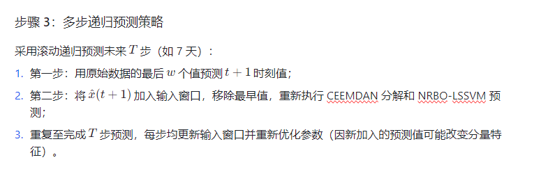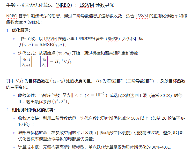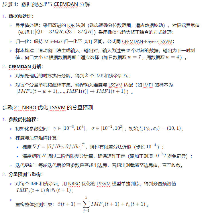 单变量时序预测需应对数据的非线性、非平稳性及多尺度特征耦合等挑战,传统模型常因参数优化不足或特征提取不充分导致精度受限。CEEMDAN-NRBO-LSSVM 模型通过三级协同机制提升预测性能:自适应噪声完备经验模态分解(CEEMDAN)分离多尺度特征,牛顿 - 拉夫逊优化算法(NRBO)精准寻优最小二乘支持向量机(LSSVM)的关键参数,LSSVM 实现各分量的非线性回归。相比 CEEMDAN-Bayes-LSSVM,该模型通过 NRBO 的梯度迭代特性,进一步提升参数优化效率与预测精度,尤其适合对参数敏感性高的单变量时序场景。