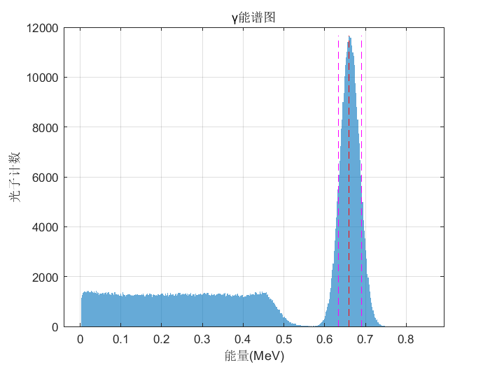 要求计算得到光子在NaI(Tl)闪烁体内的能量沉积谱。用直接模拟法模拟光子在闪烁体中的输运,记录单个光子在闪烁体中损失的能量,如果发生了光电效应,则认为损失了全部能量,如果是康普顿散射,沉积能量为碰撞前后的能量之差,最后获得光子的总沉积能量。