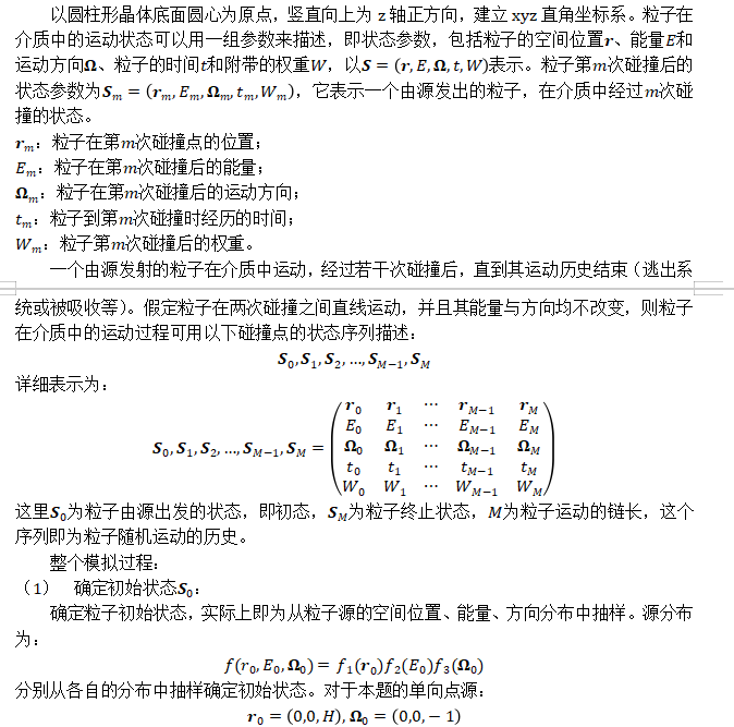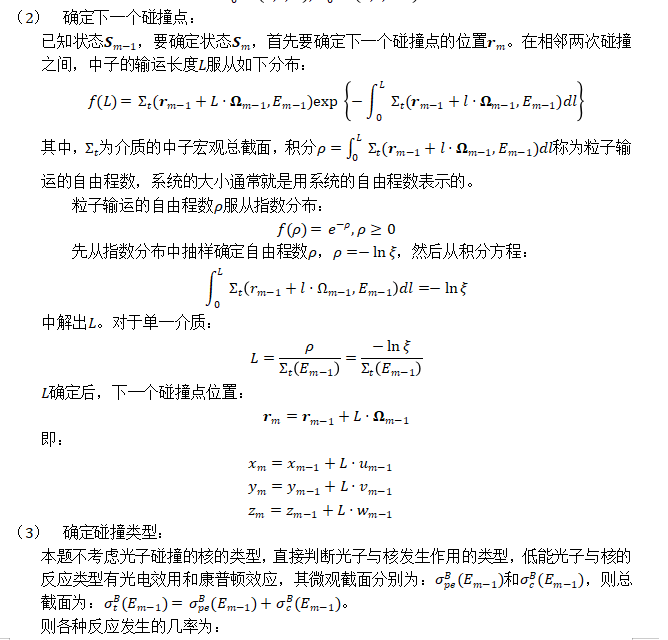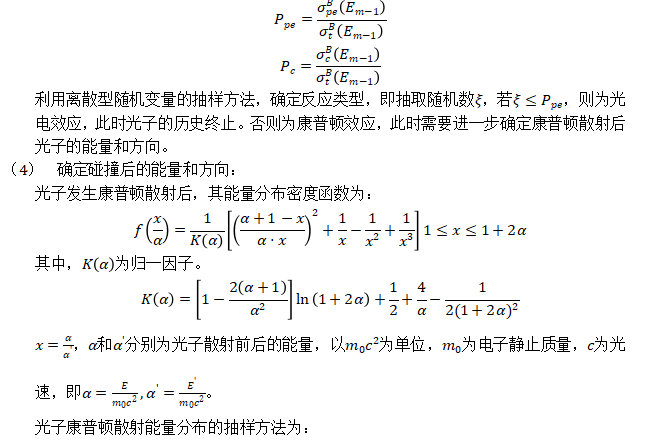 粒子输运过程是一个随机过程,输运规律是通过大量统计实验总结出来的,光子输运也是如此,因此本题采用蒙特卡罗方法模拟大量光子在截止中的运动状况。本题中,为简化问题,忽略次级光子和电子的产生,只是简单的模拟光子与核发生光电效应和康普顿散射两种过程,统计全过程中的能量沉积,在模拟过程中假定粒子在两次碰撞之间按照直线运动,粒子之间的相互作用可以忽略。