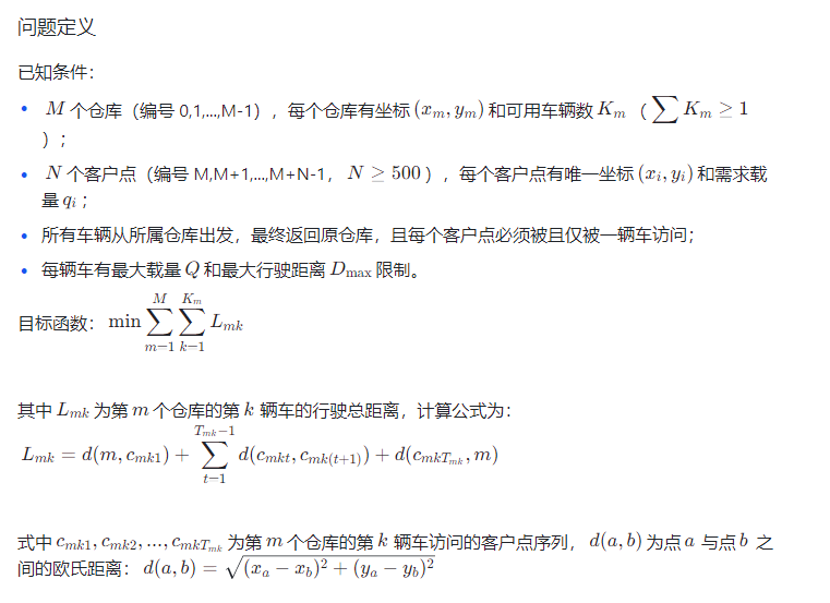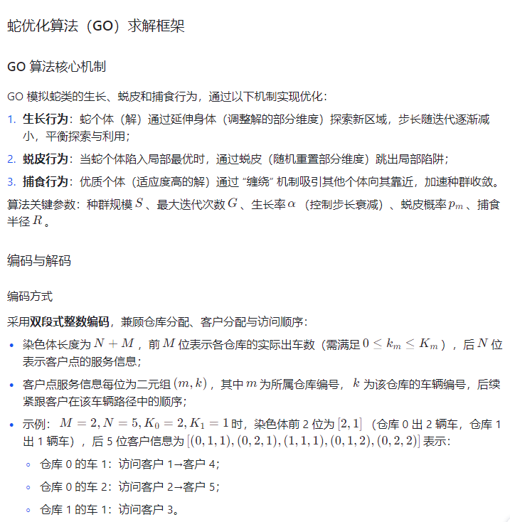 大规模多仓库多旅行商问题(LS-MDMTSP)是组合优化领域的典型难题,其核心是在多个仓库和海量客户点的场景中,安排多组旅行商(车辆)从不同仓库出发,遍历所有客户点后返回各自仓库,使总行驶距离最短且满足车辆负载、路线长度等约束。蛇优化算法(Growth Optimizer,GO)作为一种模拟蛇类生长与捕食行为的新型群智能优化算法,具有强全局搜索能力和自适应收敛特性,尤其适用于求解高维度、多约束的大规模优化问题。本文将构建 LS-MDMTSP 的数学模型,设计基于 GO 的求解框架,并通过仿真验证其在大规模场景下的有效性。