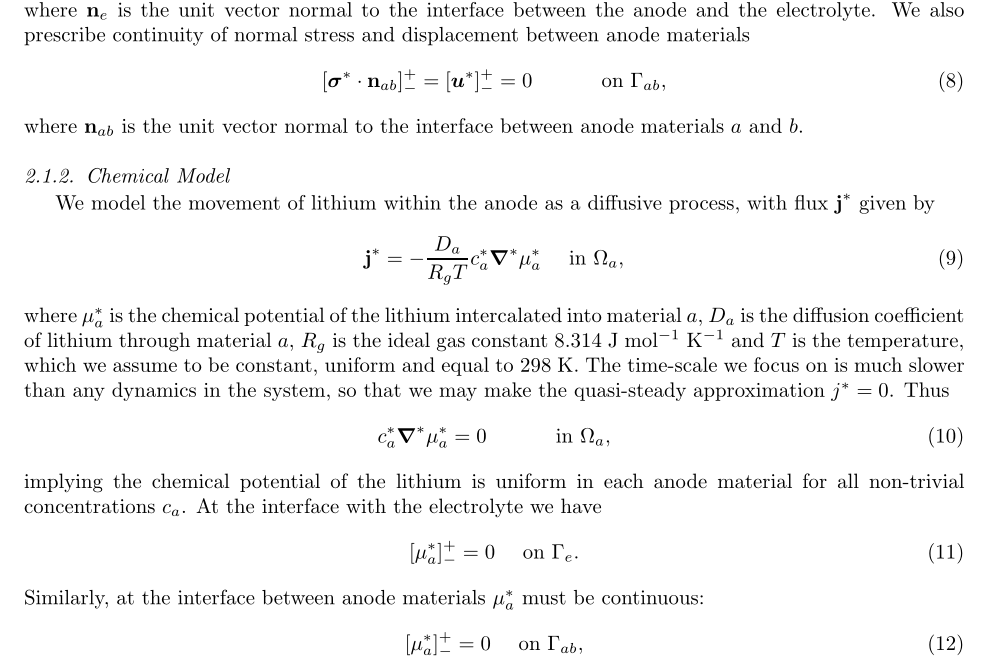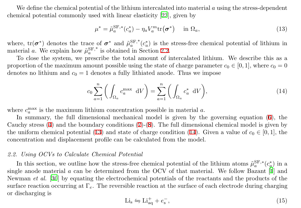 提出了一种用于预测含多种材料的锂离子电池负极开路电压(OCV)和锂分布的模型,该模型将线弹性与应力相关的化学势相结合。此模型应用于具有硅核和石墨壳的球形径向对称纳米颗粒,凸显了应力耦合对锂分布和开路电压的显著影响。基于膨胀体积、嵌入锂的量以及产生的最大应力,计算了硅核 - 石墨壳结构的多种性能指标,以便对硅核的体积进行优化。