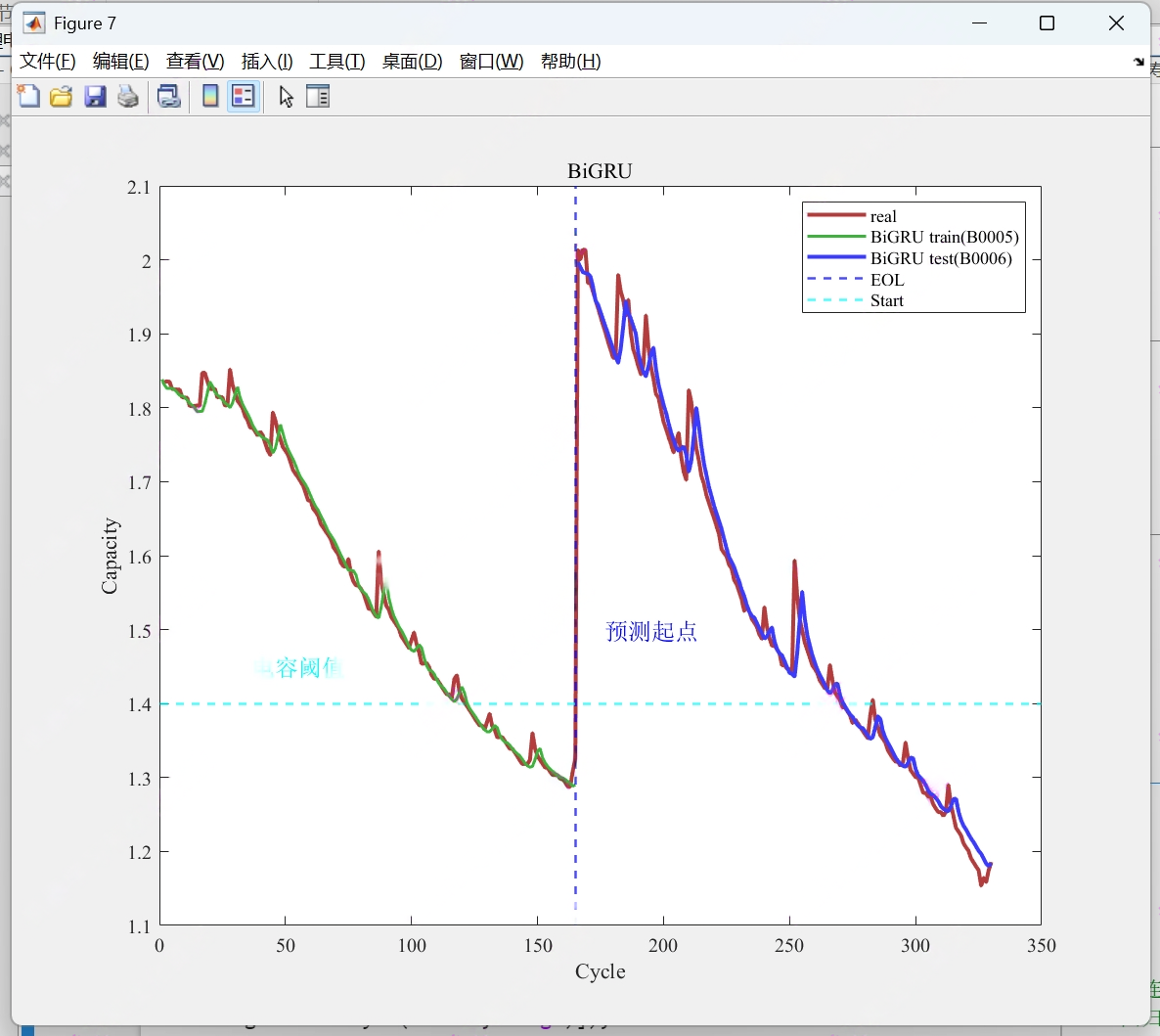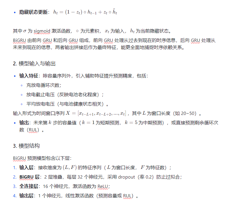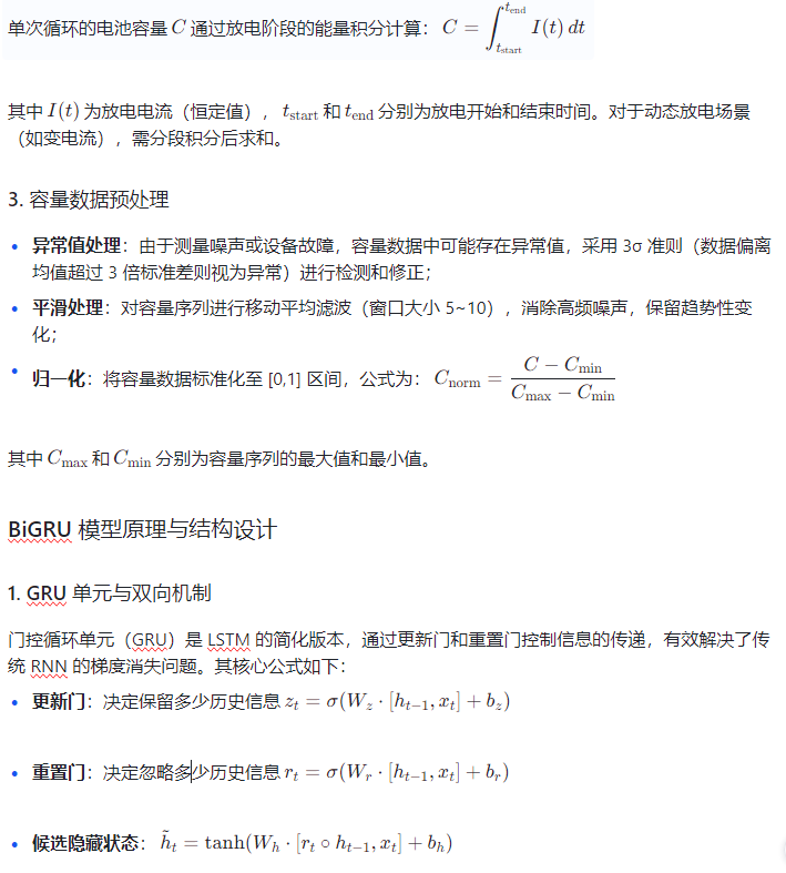 锂电池的剩余寿命(Remaining Useful Life, RUL)预测是保障电池安全运行、优化能源管理的关键技术。随着电池循环使用,其容量逐渐衰减,当容量降至初始值的 80% 以下时,通常认为电池达到寿命终点。传统的寿命预测方法(如经验模型、等效电路模型)难以捕捉电池复杂的非线性衰减特性,而深度学习中的双向门控循环单元(BiGRU)能有效处理时序数据的长期依赖关系,为锂电池 RUL 预测提供了新的解决方案。本文将结合电池容量提取方法,构建基于 BiGRU 的 RUL 预测模型,实现对锂电池寿命的精准预测。
