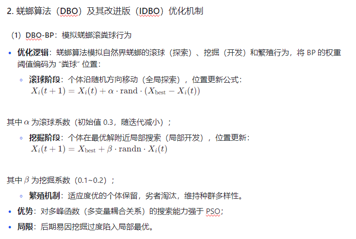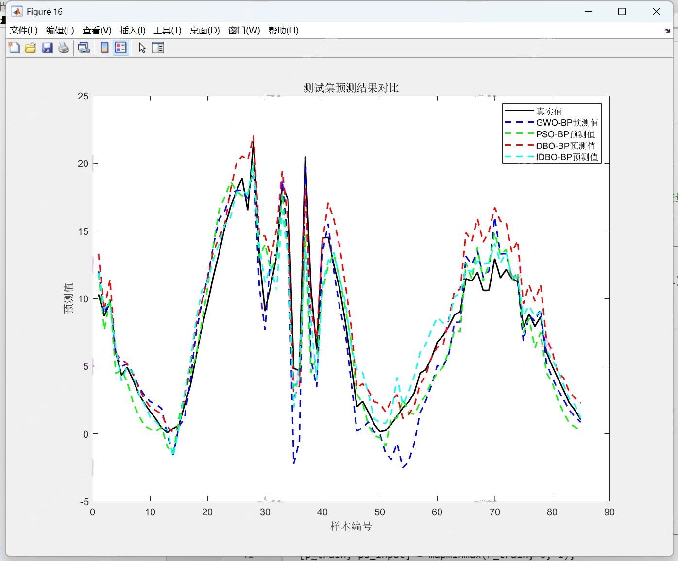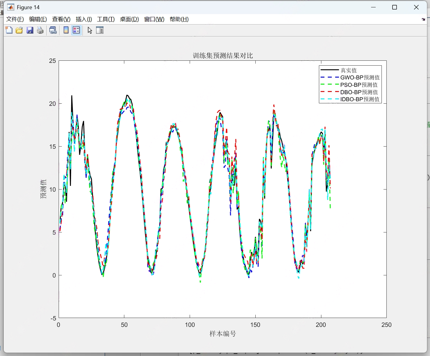 在多变量时序预测中,群智能优化算法与 BP 神经网络的融合模型已成为解决非线性、强耦合问题的有效工具。本文聚焦四种典型优化模型 —— 灰狼优化 BP(GWO-BP)、粒子群优化 BP(PSO-BP)、蜣螂优化 BP(DBO-BP)及改进蜣螂优化 BP(IDBO-BP),在多输入单输出场景下(如工业参数预测、环境因子关联分析)展开一键对比,涵盖模型原理、实验验证及 Matlab 实现代码,为工程应用提供完整参考。