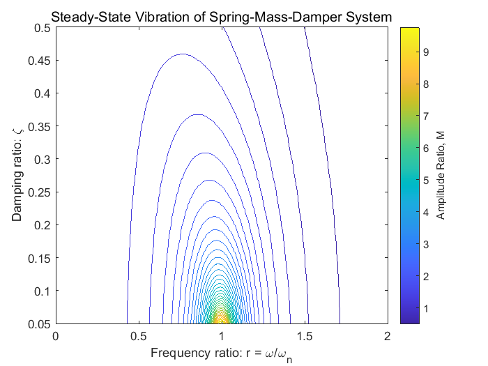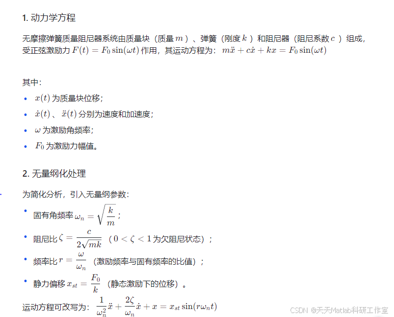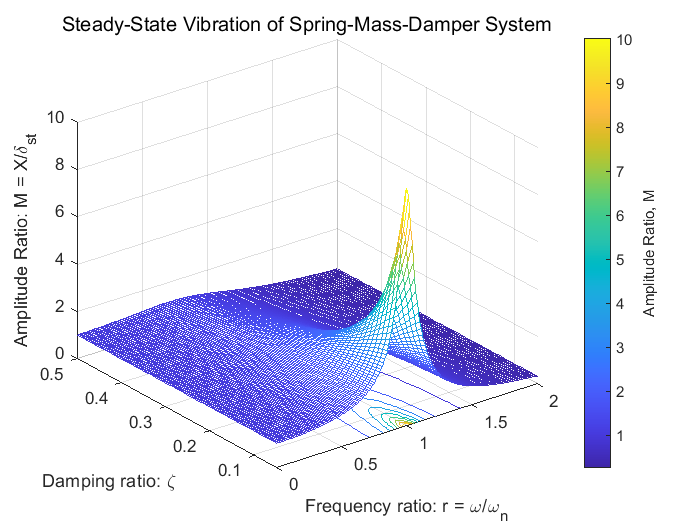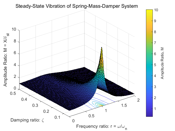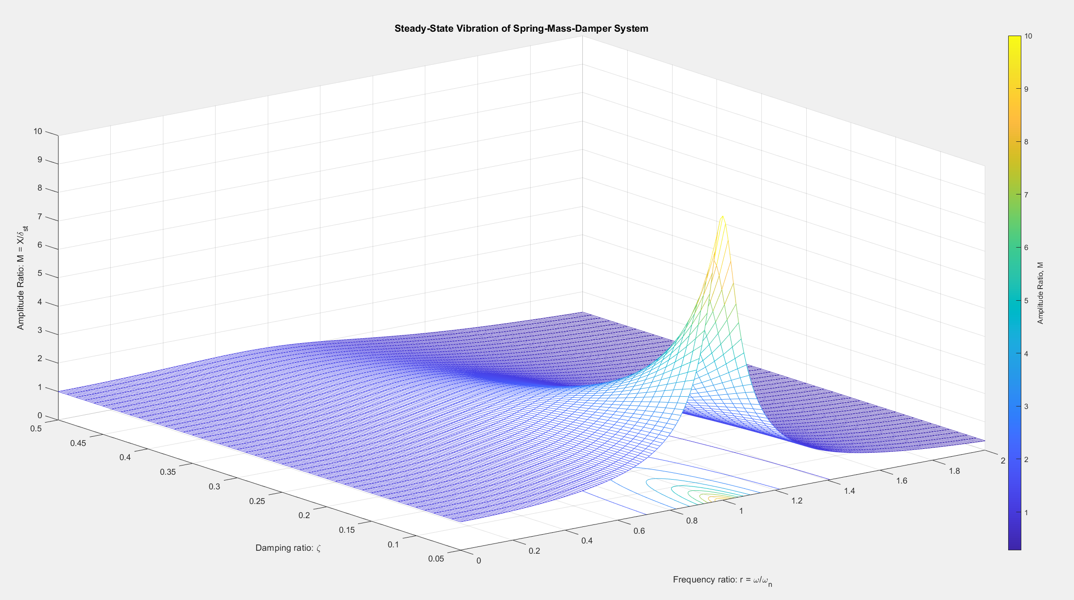 弹簧质量阻尼器系统是振动控制领域的基础模型,广泛应用于机械减震、建筑抗震等工程场景。无摩擦条件下,系统的稳态振动特性可通过解析方法精确推导,其中振幅比(稳态振幅与静力偏移的比值)是衡量系统动态响应的关键指标。本文将建立系统动力学方程,推导振幅比表达式,并通过三维曲面图直观展示其随激励频率和阻尼比的变化规律。