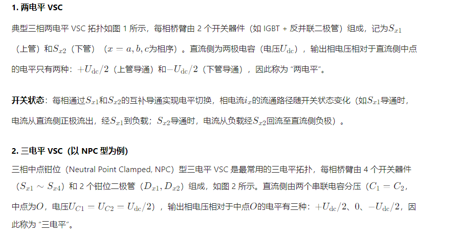 电压源转换器(Voltage Source Converter, VSC)是电力电子系统中实现直流 - 交流变换的核心装置,广泛应用于新能源并网、电机驱动、柔性直流输电等领域。电流应力(器件承受的最大电流或有效值)是评估开关器件(如 IGBT)可靠性与选型的关键指标。本文从拓扑结构、工作原理出发,建立两电平和三电平 VSC 的电流应力分析模型,并对比两者的应力特性。