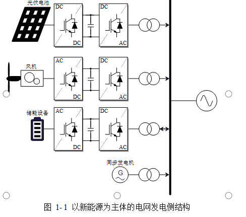 随着化石燃料的枯竭和低碳减排的要求,全球电力能源系统正面临一定程度上的变革。近年来由于电力电子元器件和可再生能源技术的成本下降,风能和太阳能光伏发电得到广泛的研究与应用。如图11所示,分布式可再生能源通常由电力电子设备接入到电网中。现代的电力系统因具有较高的新能源渗透率,正在逐渐变得比传统的基于同步发电机的系统更加复杂。从电力系统运行的角度来看,可再生能源的高渗透率主要存在两个挑战。首先,太阳能和风能发电具有随机性与波动性,它们的输出会随着环境的改变而变化,由此导致了在电力需求高峰期对电力系统平衡和资源充足性的挑战。其次,新能源通过电力电子变换器与电网进行连接,传统的同步发电机被分布式电力电子装备大量取代,给电力系统带来低惯量的挑战,导致电网的可靠性与稳定性降低。