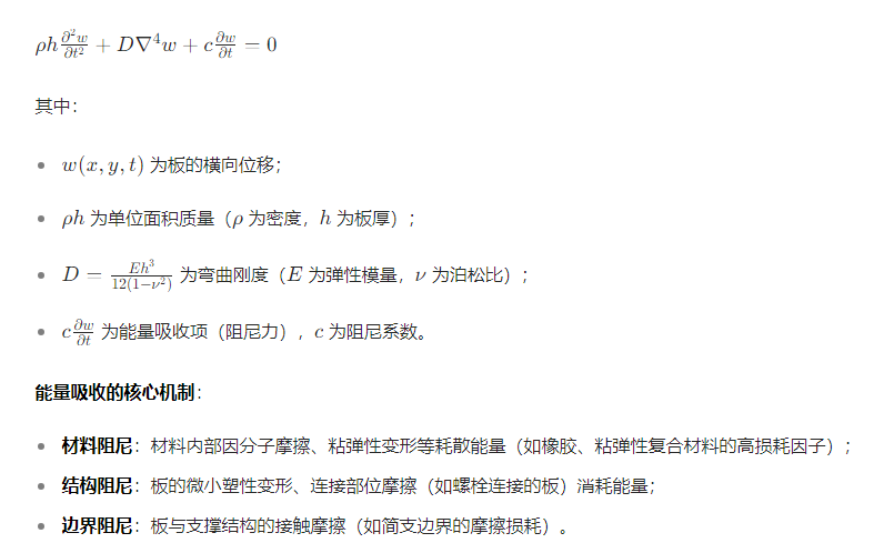 自由振动是指板在初始扰动(如瞬间冲击、位移激励)后,仅在自身弹性恢复力和能量吸收机制作用下的振动(无持续外部激励)。能量吸收在此过程中主导振动的衰减特性。