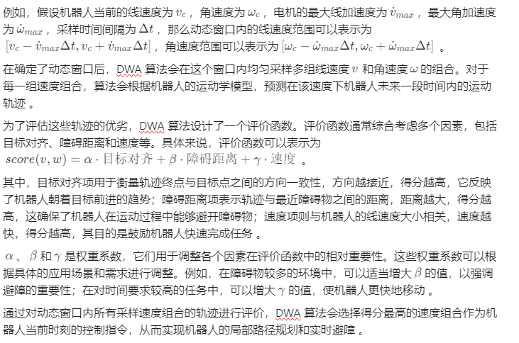 DWA 算法作为一种局部路径规划算法,主要用于解决机器人在复杂动态环境中的实时避障和路径调整问题。其核心机制是基于机器人的动态约束,在速度空间中进行采样,生成一系列可行的速度组合,并对每个速度组合下的运动轨迹进行评估,最终选择最优的速度指令来控制机器人的运动 。