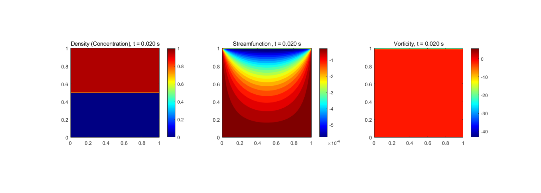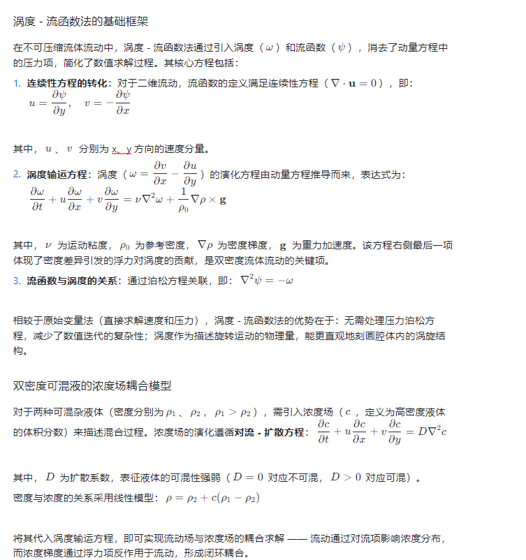 传统研究多聚焦于单种均质流体,然而实际工业场景中,两种不同密度的可混杂液体(如含杂质的冷却剂、油水混合液、梯度浓度溶液)的流动更为常见。这类流动的核心难点在于:密度差异引发的浮力效应与盖子驱动产生的剪切效应相互耦合,形成复杂的涡旋演化规律;同时,液体的可混性导致界面动态扩散,进一步加剧了流动场与浓度场的耦合作用。现有数值方法在处理这类耦合问题时,常面临精度不足(如界面捕捉失真)或计算效率低下的问题。因此,构建基于涡度 - 流函数法的高效数值模型,揭示双密度可混液在盖子驱动腔内的流动机理,具有重要的理论与应用价值。