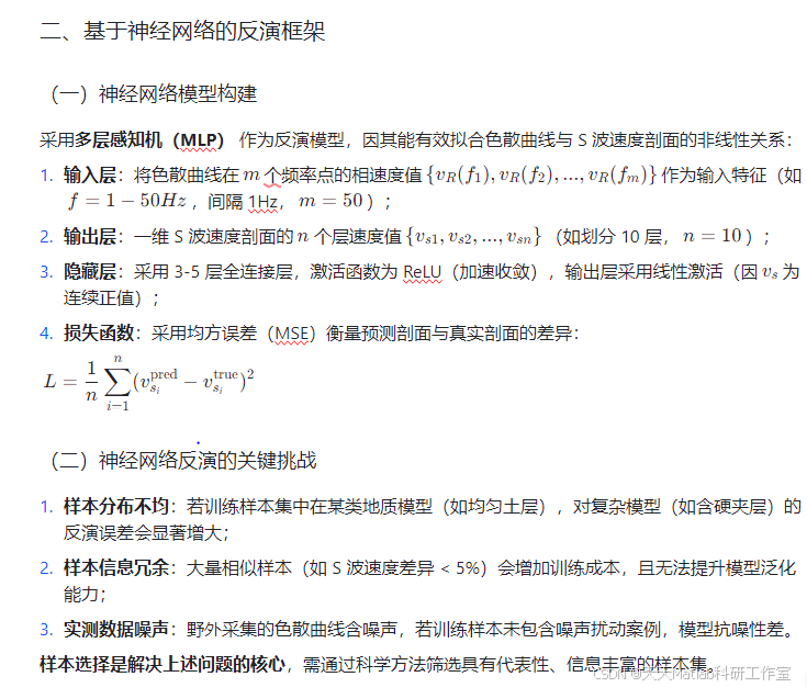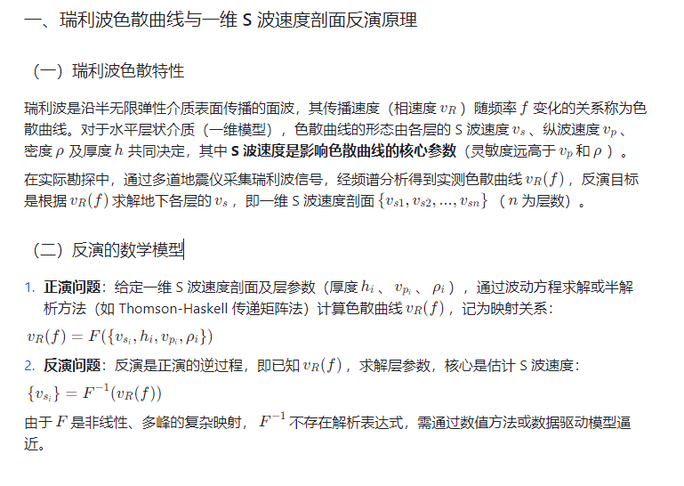 瑞利波勘探作为一种高效的面波勘探方法,通过分析瑞利波的色散特性反演地下介质的 S 波速度剖面,在工程地质勘察、环境地质调查等领域应用广泛。一维 S 波速度剖面反演是瑞利波勘探的核心任务,其本质是通过地表观测的瑞利波色散曲线(相速度 - 频率关系)反推地下不同深度的 S 波速度分布。传统反演方法(如阻尼最小二乘法)存在收敛速度慢、易陷入局部最优等问题,而神经网络凭借强大的非线性映射能力为反演提供了新途径。然而,神经网络的反演精度高度依赖训练样本的质量与分布,不合理的样本选择会导致模型泛化能力差、反演误差大。本文将构建基于神经网络的瑞利波色散曲线反演框架,重点研究样本选择方法,通过优化样本的分布特性与信息含量,提升一维 S 波速度剖面的反演精度。