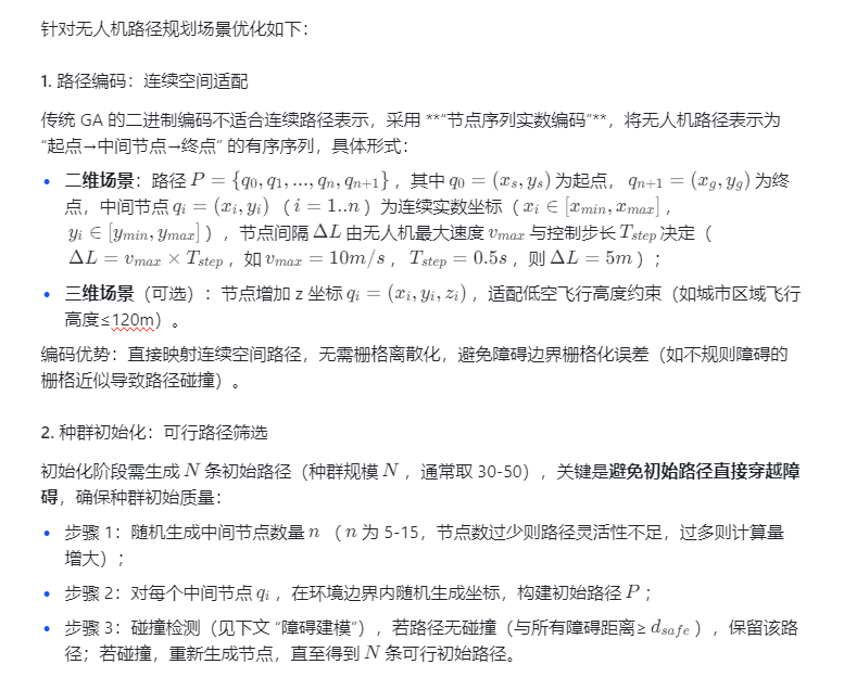 传统路径规划算法(如 A*、RRT)在多障碍环境中存在局限:A * 依赖栅格地图,障碍密集时栅格数量激增导致计算量暴增;RRT 随机采样效率低,易生成冗余绕障路径。遗传算法(Genetic Algorithm, GA)作为全局优化算法,通过 “种群迭代进化” 模拟生物自然选择,无需栅格建模,可直接在连续空间中搜索最优路径,且能通过多目标适应度函数平衡路径 “安全性 - 最优性 - 约束满足”,成为多障碍环境下无人机路径规划的优选方案。