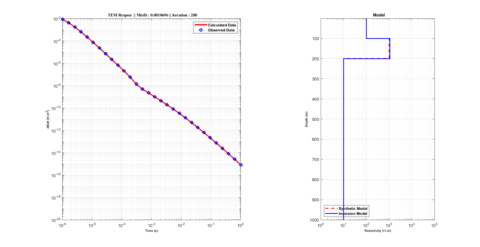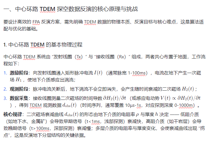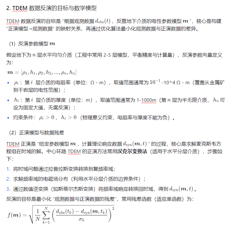 )。然而,TDEM 数据反演本质是 “非线性病态问题”—— 正演模型复杂(电磁扩散方程求解困难)、观测数据含噪声、反演参数多(多层介质),传统反演方法(如最小二乘法、梯度下降法)易陷入局部最优,导致反演结果与实际地质结构偏差较大。