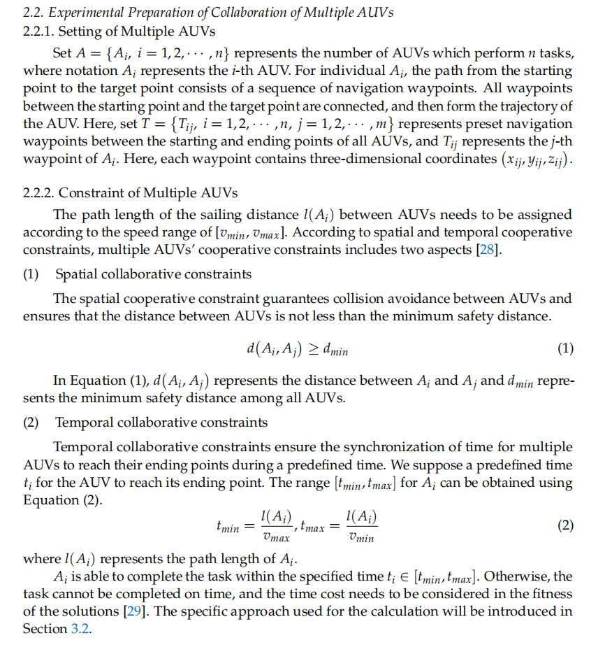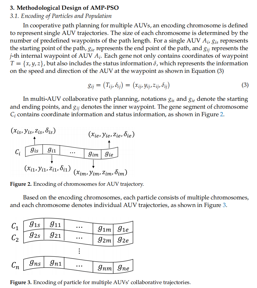- 路径表示:将每台 AUV 的路径离散为 “起点→航点 1→航点 2→...→终点”,每个航点的坐标(x,y,z)为优化变量;4 台 AUV 的路径组合构成一个 “粒子”,粒子维度 = 4 台 AUV× 航点数 ×3(坐标维度);