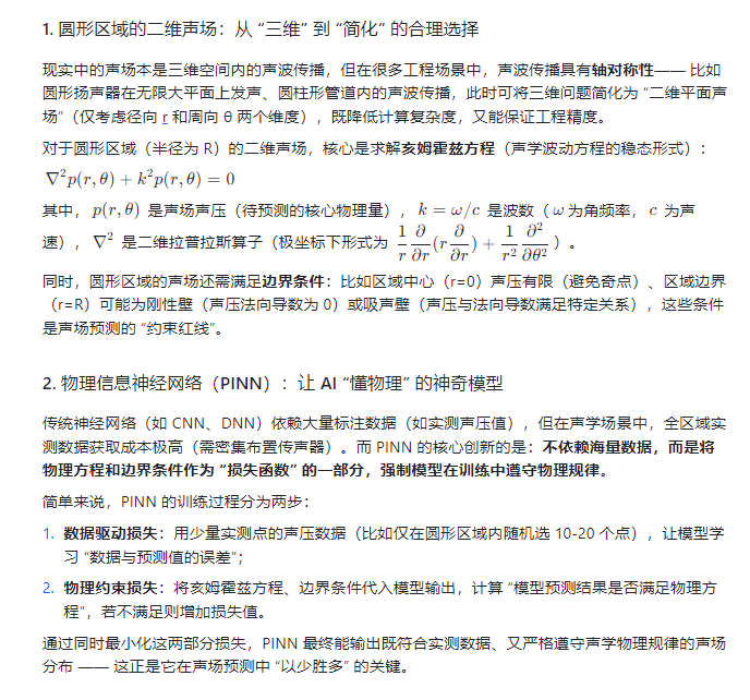 而今天要介绍的物理信息神经网络(PINN),正为解决这一难题提供了全新思路。它无需依赖大量实测数据,而是将声学物理方程 “嵌入” 神经网络模型,让 AI 在学习过程中自动满足物理规律,尤其在圆形这类具有对称性的区域内,展现出了惊人的效率与精度优势。