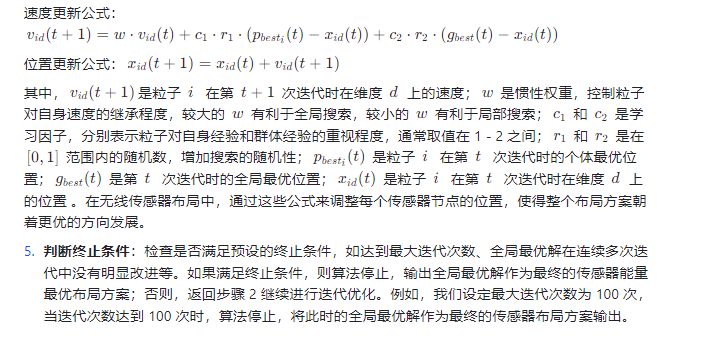 - 位置:粒子的位置表示它在解空间中的坐标,对应优化问题的一个具体解。对于传感器布局,位置就是各个传感器节点在监测区域中的实际位置。