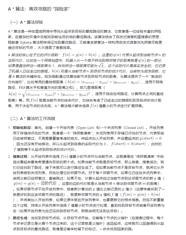 路径规划在机器人领域中占据着举足轻重的地位,它是机器人实现自主运动和完成任务的核心技术之一。在工业生产中,机器人路径规划的优劣直接影响着生产效率和产品质量。如果机器人的路径规划不合理,可能会导致生产时间增加、能源消耗增大,甚至出现碰撞等安全问题。在物流运输领域,高效的路径规划可以使仓储机器人更快地完成货物的搬运和分拣,提高物流效率,降低运营成本。而对于家庭服务机器人来说,精准的路径规划能够让它们更好地适应家庭环境,为我们提供更加便捷的服务。那么,机器人究竟是如何做到精准规划路径的呢?这就不得不提到 A * 算法和 Q - Learning 算法了。
