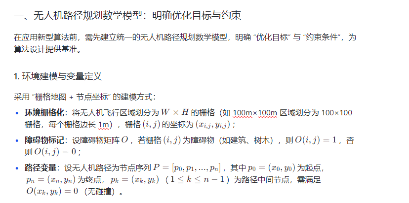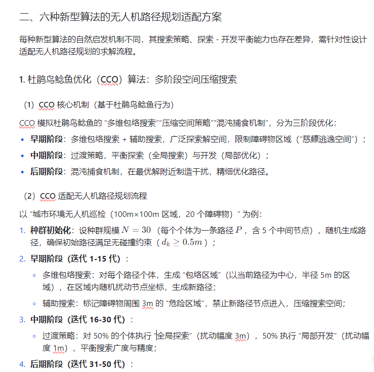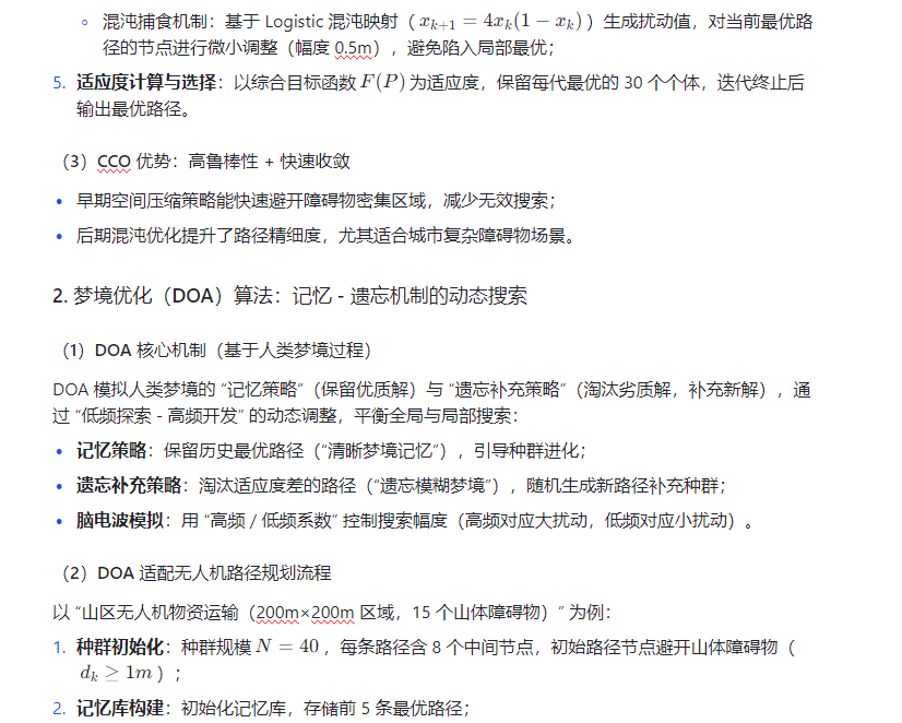 无人机路径规划是实现自主飞行的核心技术,需在复杂环境(如城市建筑群、山区、电力巡检区域)中,满足 “避障安全、路径最短、能耗最低、实时性强” 四大核心需求。传统优化算法(如 A*、粒子群优化)在面对高复杂度、多约束场景时,常出现 “陷入局部最优”“收敛速度慢”“鲁棒性不足” 等问题。而 2024-2025 年提出的杜鹃鸟鲶鱼优化(CCO)、梦境优化(DOA)、牛优化(OX)、山羊优化(GOA)、海市蜃楼搜索优化(MSO)、龙卷风优化(TOC) 六种新型元启发式算法,凭借独特的自然启发机制与高效的搜索策略,为无人机路径规划提供了全新解决方案。本文将结合无人机路径规划数学模型,详细拆解每种算法的适配逻辑、求解流程与应用优势。