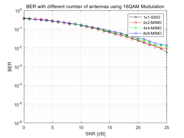 本文通过仿真实验,系统对比不同天线数量(2×2、4×4、8×8)与不同调制类型(QPSK、16QAM、64QAM)下 MIMO 信道的关键性能指标(信道容量、误码率、频谱效率),为实际通信系统的参数配置提供理论与仿真支撑。