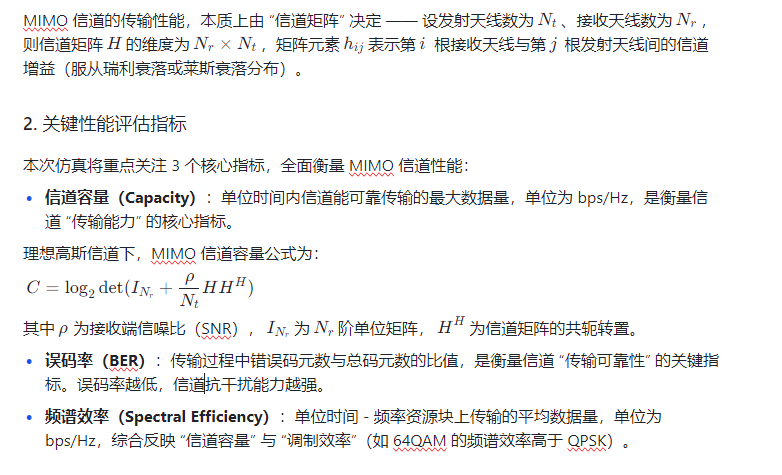 在开展仿真前,需先明确 MIMO 信道的核心原理与关键评估指标,为后续对比分析奠定基础。